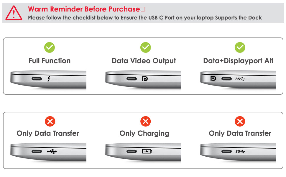 Please make sure that the USB C PD port of this laptop docking station dual monitor is connected to the power supply, it is recommended to use the original charging cable of the notebook(above 65W). And the Type C PD port is ONLY used for power supply.