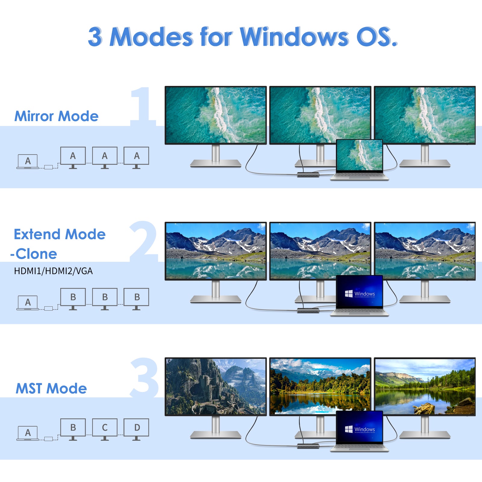 - Mirror Mode + Extend Mode Support: for Windows OS., the USB C Docking Station Dual Monitor supports 3 modes, MIRROR MODE - 3 external displays show the same content as the laptop. EXTEND MDE - the 3 external devices display the same content, but different from the laptop, and MST MODE -the display of the 3 external devices are different from that of the laptop. For Mac OS., the MST mode is NOT SUPPORTED, the laptop docking stations only support Mirror and Extend Mode